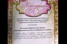 Коллектив Байрякинской средней общеобразовательной школы получил БЛАГОДАРНОСТЬ Академии военно-исторических наук Российской Федерации и Волго-Уральского центра отделения "Археология и антропология" РАЕН-РАО за активную работу по поддержке в деле изучения историко-культурных памятников в Восточном Татарстане и воспитанию молодого поколения в духе патриотизма и интернационализма, в рамках года российской истории и историко-культурного наследия РТ