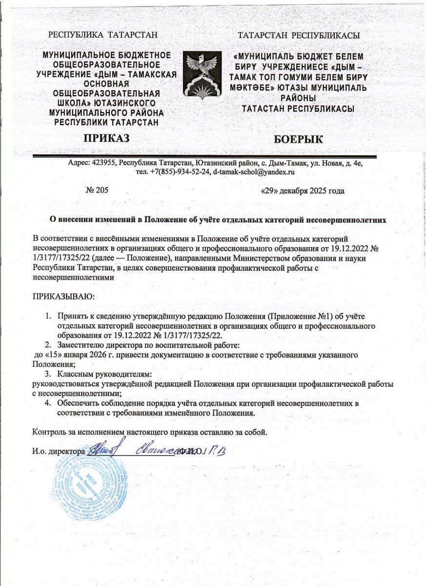 Приказ о внесении изменений в положение об учёте отдельных категорий несовершеннолетних 2025 г.