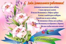 Поздравляю с Днём воспитателя и всех дошкольных работников. Желаю, чтобы за Вашу смелую профессию, за Ваш нелёгкий, но такой важный труд, каждый день вознаграждал Вас радостью, удачей и благополучием. Желаю всегда находить общий язык с детками и с лёгкостью уметь завлекать их в любое дело, желаю не сталкиваться с трудностями на пути к успеху и всегда чувствовать себя счастливым человеком!