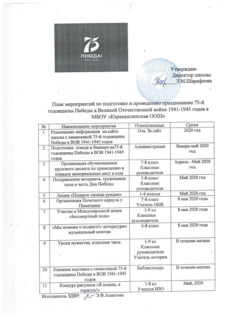 - Бөек Җиңүнең 75 еллыгына багышланган чаралар планы/План мероприятий по подготовке и проведению празднования 75-летней годовщины Победы в Великой Отечественной войне 1941-1945 годов 30.01.2020