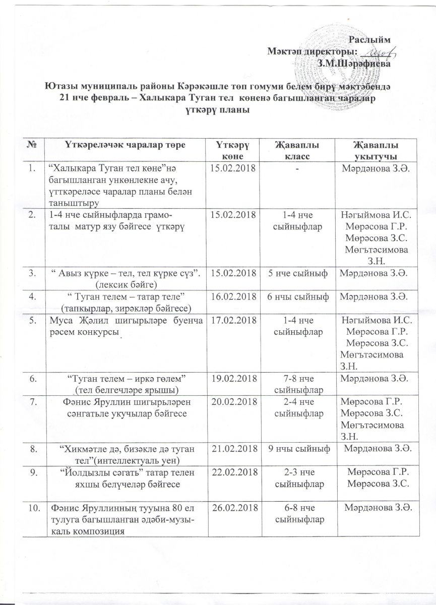 Халыкара Туган тел көненә багышланган чаралар үткәрү планы 06.02.2018