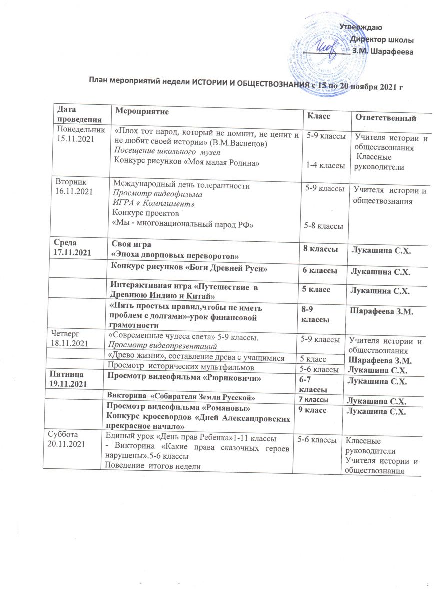 План недели истории и обществознания/ Тарих һәм җәмгыять белеме атналыгы планы 17.11.2021