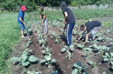 Воспитанники лагеря труда и отдыха поливают и пропалывают грядки.