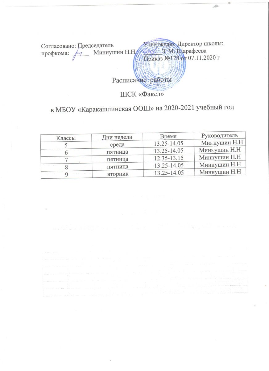 Расписание работы ШСК "Факел" на 2020-2021 учебный год