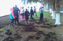 Учащиеся 4 класса работали на пришкольном участке.Они разбили цветники и клумбы на своем закрепленном участке.
