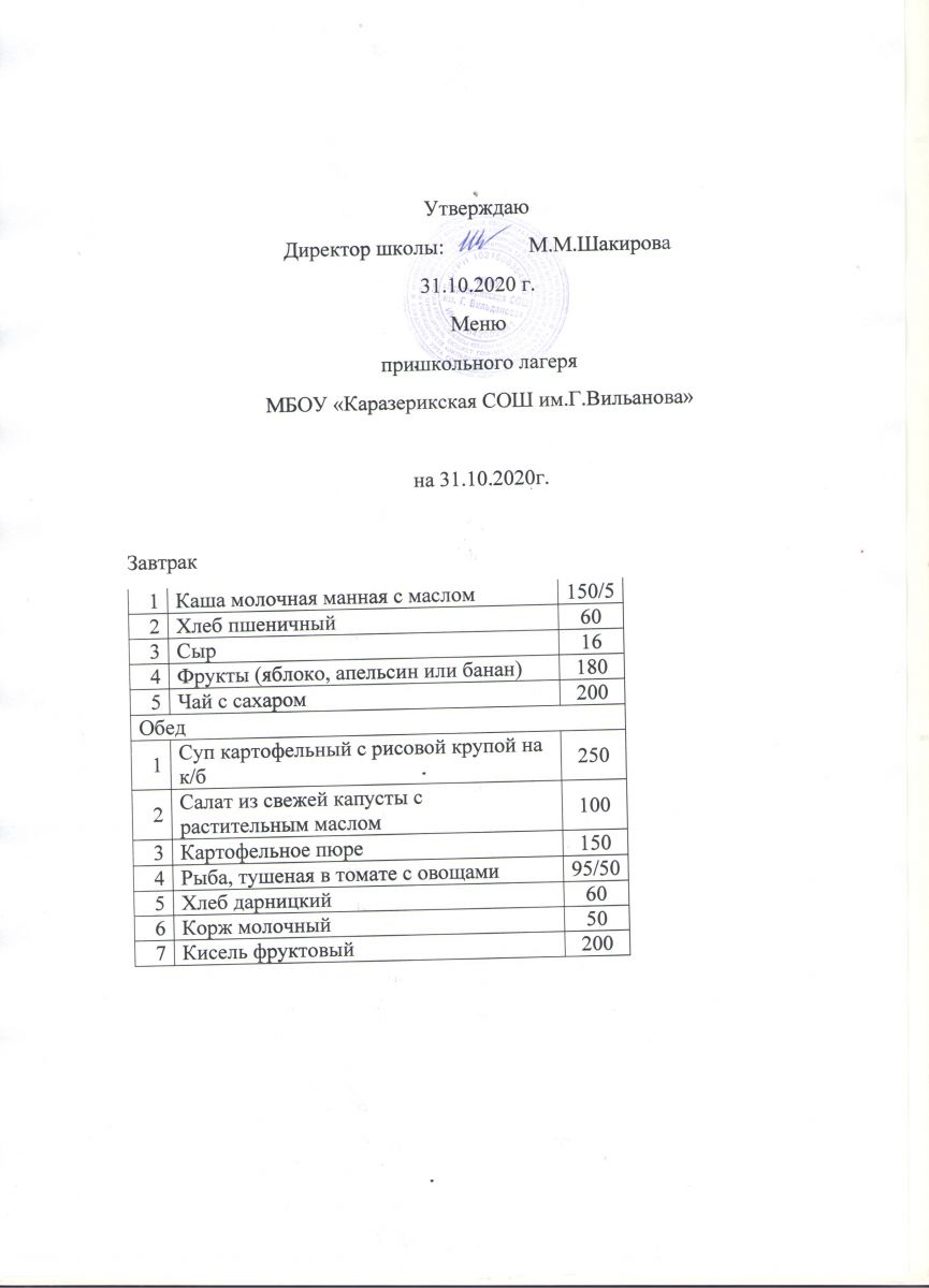 Меню пришкольного лагеря на 31.10.2020