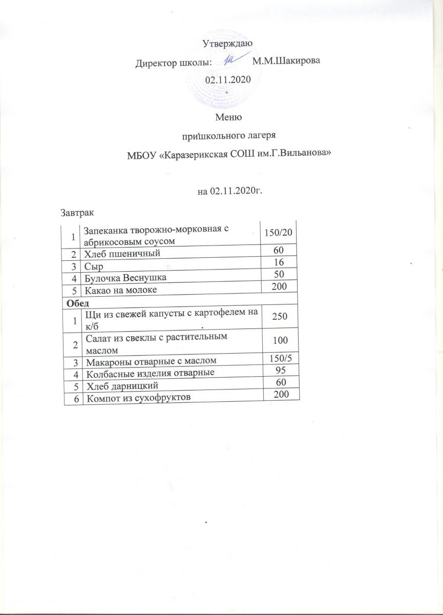 Меню пришкольного лагеря на 02.11.2020