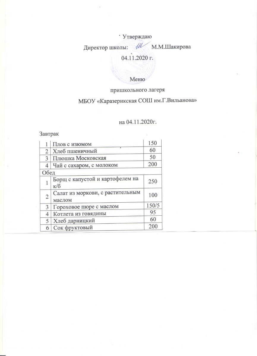 Меню пришкольного лагеря на 04.11.2020