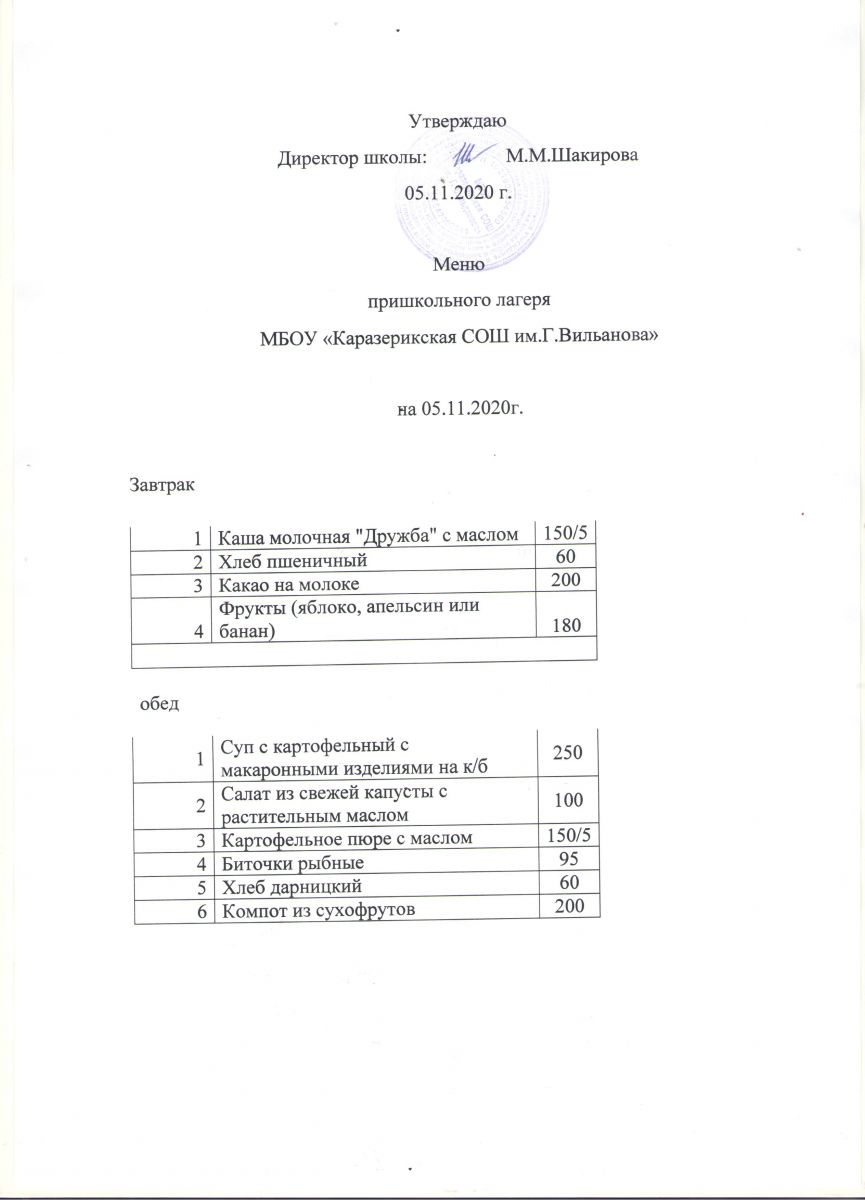 Меню пришкольного лагеря на 05.11.2020