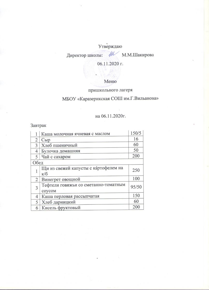 Меню пришкольного лагеря на 06.11.2020