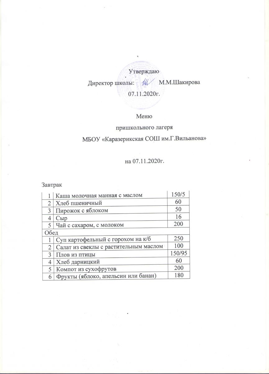 Меню пришкольного лагеря на 07.11.2020