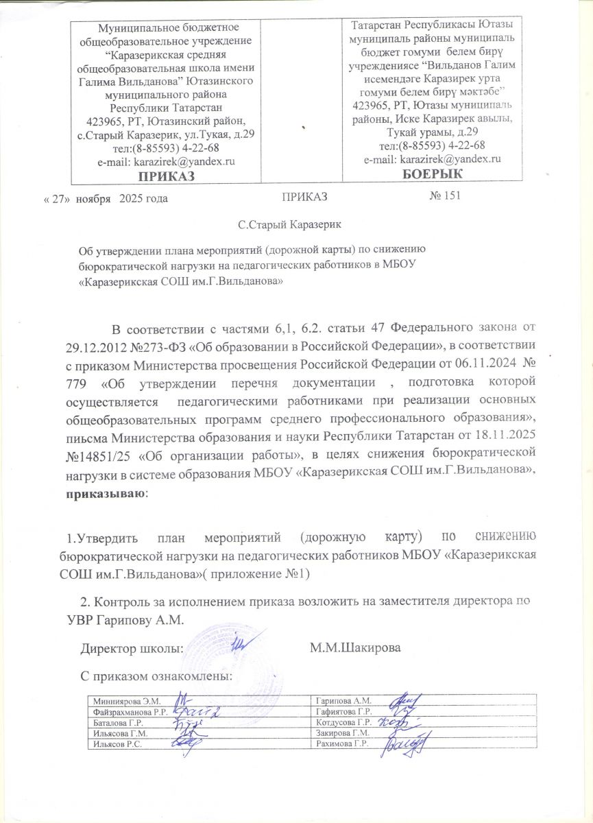 План мероприятий ("дорожная карта") по снижению бюрократической нагрузки на педагогических работников в МБОУ "Каразерикская СОШ им.Г.Вильджанова"