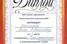 Конкурс чтецов проходил на базе МБДОУ "Детский сад №4" п.г.т. Уруссу. От нашего детского сада приняла участие воспитатель Мингазова Зиля Амирзяновна со стихотворением "Воспитатель". И получила диплом за 1 место в номинации "Приз зрительских симпатий") .