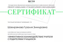 Классный руководитель 2,3 классов Шакирзянова Г.З. приняла участие в республиканском вебинаре-практикуме "Эффективное взаимодействие учителя с родителями учащихся"