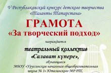 Поздравляем театральный коллектив нашей школы с победой в V Республиканском конкурсе детского творчества "Таланты Татарстана" в номинации "Театральное творчество" (руководители: Садрутдинова Г.А. и Рахимова А.Я.)