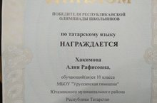 Хакимова Алия Рафисовна, ученица 10 класса МБОУ «Уруссинская гимназия» стала ПОБЕДИТЕЛЕМ республиканской олимпиады школьников по татарскому языку для учащихся школ с татарским языком обучения. Молодец!