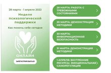 Если вам или вашим близким нужна психологическая помощь в ситуации стресса и тревоги, эксперты недели психологической поддержки помогут вам найти точки опоры, восполнить собственные ресурсы и поддержать своих детей.Ссылка для регистрации