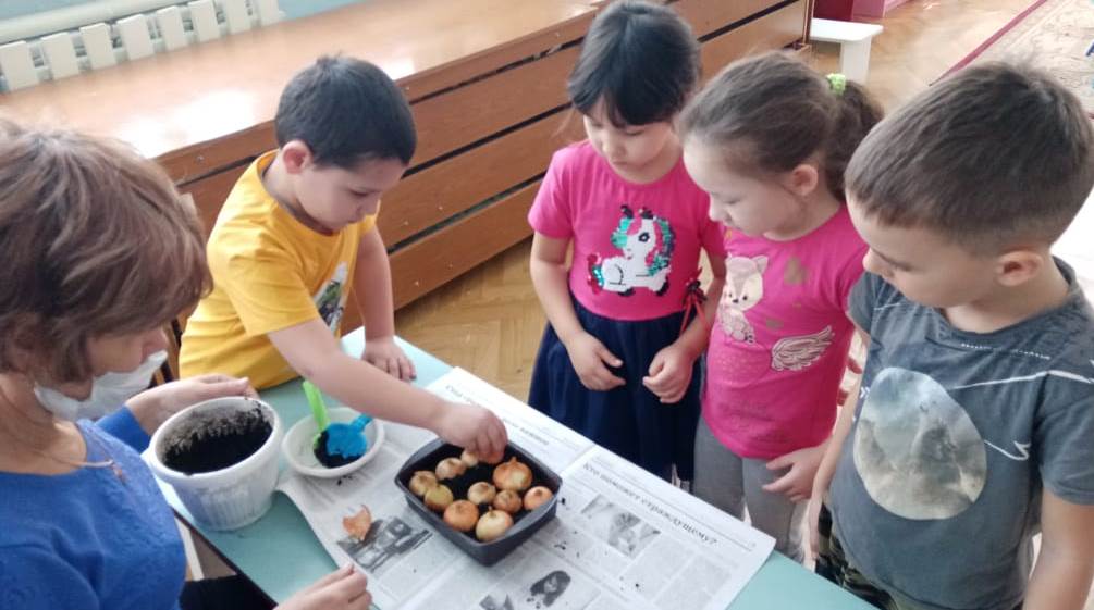 Посадка лука в землю на подоконнике в детском саду.