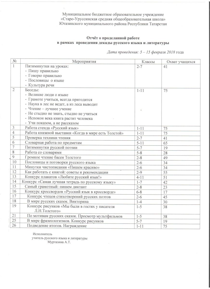 По итогам декады русского языка и литературы в школе была проведена линейка, на которой были вручены призы. Все обучающиеся приняли активное участие: выпустили стенгазеты, составили ребусы и кроссворды, написали общешкольный диктант, организовали громкое чтение басен Л.Н.Толстого. Эстафета была передана декаде татарского языка и литературы.