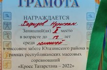 Ученик 9 класса Хафизов Нурислам занял 1 место в возрасте до 18 лет среди юношей в массовом забеге Ютазинского района в рамках республиканских массовых соревнований "Кросс-Татарстана -2022".