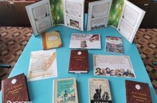 Книжная выставка в школьной библиотеке в рамках месячника военно-патриотической работы, на которой вниманию обучающихся представлены произведения русских и татарских писателей о ВОВ, а также написанных в период войны