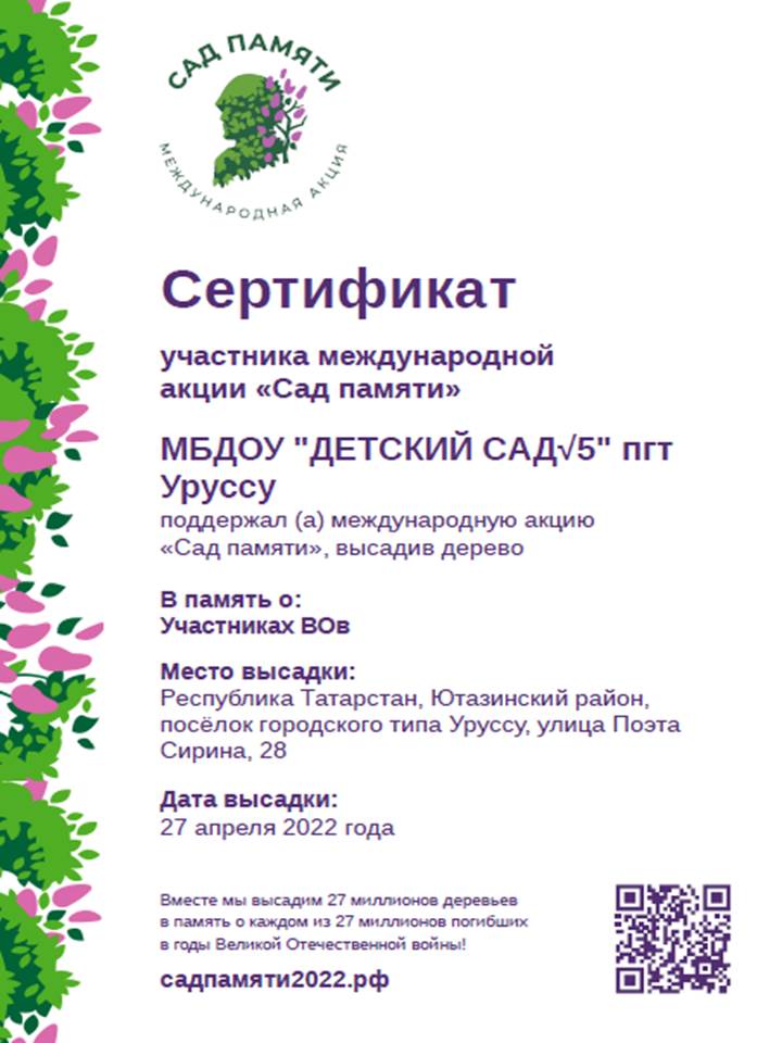18 марта 2022 года стартовала Всероссийская и международная акция «Сад памяти» приуроченная к ежегодному празднованию Дня победы. Наш детский сад пподдержал акцию, высадив на территории 5 саженцев рябины.