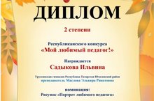 Дипломом 2 степени Республиканского конкурса «Мой любимый педагог» награждена Садыкова Ильвина. Руководитель Маслова Эльвира Ринатовна. Поздравляем и желаем новых творческих успехов!