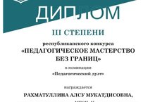 Диплом 3 степени Республиканского конкурса «Педагогическое мастерство без границ» 01.06.2021