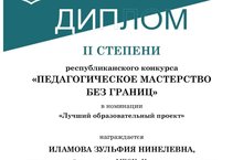 Поздравляем учителя английского языка Иламову Зульфию Нинелевну, получившую диплом 2 степени Республиканского конкурса «Педагогическое мастерство без границ» в номинации «Лучший образовательный проект»!!!