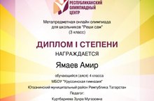 Обучающийся 3в класса МБОУ "Уруссинская гимназия" Ямаев Амир получил диплом l степени за победу в метапредметной олимпиаде для школьников "Реши сам", организованной Республиканском олимпиадным центром.