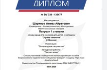 Обучающийся 2Б класса МБОУ «Уруссинская гимназия» Шарипов Алмаз стал лауреатом 1 степени Международного конкурса для детей и молодежи «Страна талантов» (г.Москва), в номинации «Литературное творчество», конкурсная работа «Письмо маме». Руководитель Рахматуллина Алсу Мукатдисовна. Поздравляем и желаем творческих успехов!!!
