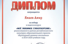 Ученик 3в класса МБОУ " Уруссинская гимназия" Ямаев Амир стал победителем республиканского видеоконкурса "Моё любимое стихотворение", реализованного в рамках республиканского культурно-образовательного проекта " Культурный дневник школьника" в 2019-2020 учебном году. Поздравляем и желаем дальнейших успехов!