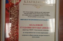 Директор МБОУ «Уруссинская гимназия» Белалова Гульдания Нурлыгаяновна награждена Благодарностью от местной общественной организации «Федерация греко-римской борьбы Ютазинского муниципального района республики Татарстан», за сотрудничество и популяризацию здорового образа жизни подрастающего поколения.