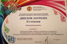 Вокальный ансамбль «Мизгел» МБОУ «Уруссинская гимназия» завоевал диплом лауреата II степени "Народный ансамбль" на Республиканском детском художественном фестивале народного творчества! Поздравляем наших артистов и желаем им дальнейших творческих успехов!