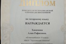 Поздравляем победителя Республиканской олимпиады школьников по татарскому языку Хакимову Алию, обучающуюся 10 класса, МБОУ «Уруссинская гимназия». Желаем успехов в учебе!