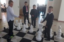В гимназии учащиеся начальной школы обучаются игре в шахматы через взаимодействие старшеклассников с учениками начальной школы. Созонова Кристина обучает второклассников