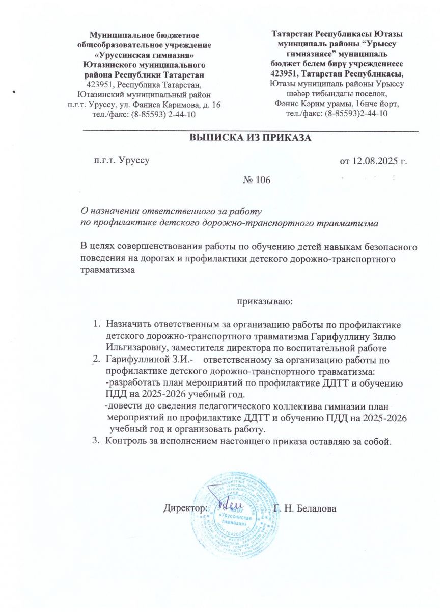 Приказ о назначении ответственного за работу по профилактике ДДТТ 2025-2026