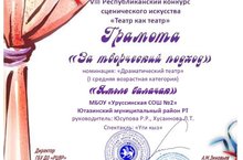 Театральная группа школы "Ямьле балачак" была награждена Грамотой за творческий подход в VIII Республиканском конкурсе сценического мастерства"Театр как театр". -