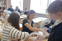 Ребята помогают ДВО «Доброшвеи-УрусСуп» расфасовывать сухарики и стикировать пакеты, в которые волонтеры упаковывают сухие супы и каши для отправки гуманитарной помощи на фронт СВО.