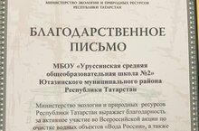 Министерство экологии и природных ресурсов Республики Татарстан выражает благодарность за активное участие во Всероссийской акции по очистке водных объектов "Вода России", а также экологического просвещение подрастающего поколения Республики Татарстан награждает благодарственным письмом