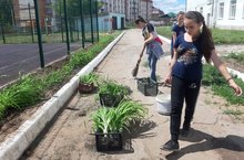 Ребята из лагеря труда и отдыха занимались посадкой цветов и прополкой цветочных клумб.