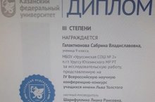 Обучающаяся 9-го класса Галактионова Сабрина стала дипломантом 3 степени Всероссийского конкурс- конференции им Л.Н.Толстого. Поздравляем!