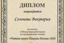 Поздравляем нашу юную читательницу Созонову Викторию с получением диплома за участие в Международной акции "Читаем книги Николая Носова 2020"
