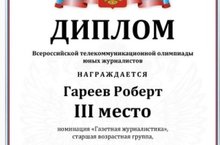 Гареев Роберт стла дипломантом Всероссийской телекоммуникационной олимпиады юных журналистов в номинации "Газетная журналистика".Поздравляем!