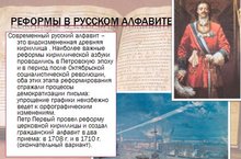 В рамках декады среди обучающихся 5-9 классов прошёл конкурс «Радуга презентаций», рассказывающий интересные факты из истории языка. Были представлены разные презентации. Презентация учеников 8 «А» класса «Реформы азбуки» оказалась интересной и содержательной. В ней ребята рассказали об изменениях в славянской азбуке, о реформах, которые прошли в азбуке и коснулись истории некоторых букв. Эта презентация имела материал для закрепления «Своя игра». Восьмиклассники рекомендовали использовать свою презентацию не только на внеклассных мероприятиях, но и на уроке.