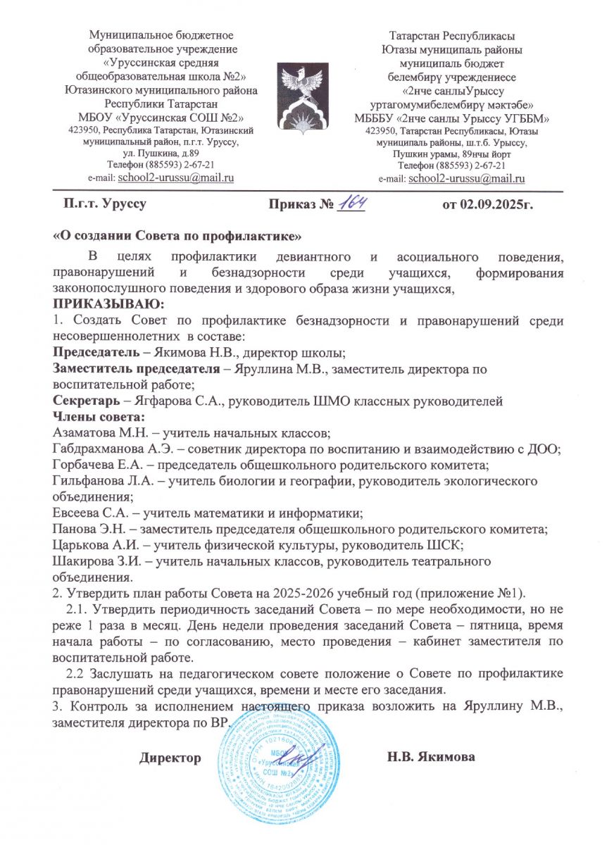 Положение о Совете по профилактике безнадзорности и правонарушений в МБОУ "уруссинская СОШ"2"