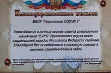 Школе вручили Благодарственное письмо за оказанную помощь мобилизованным от полковника С. Х.Хайрутдинова, врио командира 26 отдельного отряда специального назначения ПФО федеральной службы войск национальной гвардии РФ.