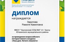 11 нче декабрь көнне 8В сыйныф укучылары өчен экологик темага багышланган “Безнең өй. Артык әйбер булмасын” дип аталган сыйныф сәгате узды. Дәресне ЭКОКЛАСС.РФ порталы материалларын кулланып үткәргән өчен укытучы Зарипова Р.К. диплом һәм Рәхмәт хаты белән бүләкләнде.