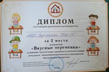 Поздравляем команду школы: Маргариту Зхххх, Артура Мхххх, Дамира Нхххх, занявших 2 место в республиканском конкурсе видеороликов "Вкусные переменки" , проводимого в рамках пропаганды здорового питания учащихся общеобразовательных учреждений Республики Татарстан. Благодарим наставника: Галимову Лилию Фоатовну, педагога-организатора.