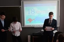 В рамках празднования годовщины воссоединения Крыма с Россией в 9 А классе Миллер Гейнрих Эдуардович, учитель географии, провел тематический урок «Крым и Россия - общая судьба». Он рассказал ученикам об истории Крыма и России, о деятельности «Русской общины Крыма».
